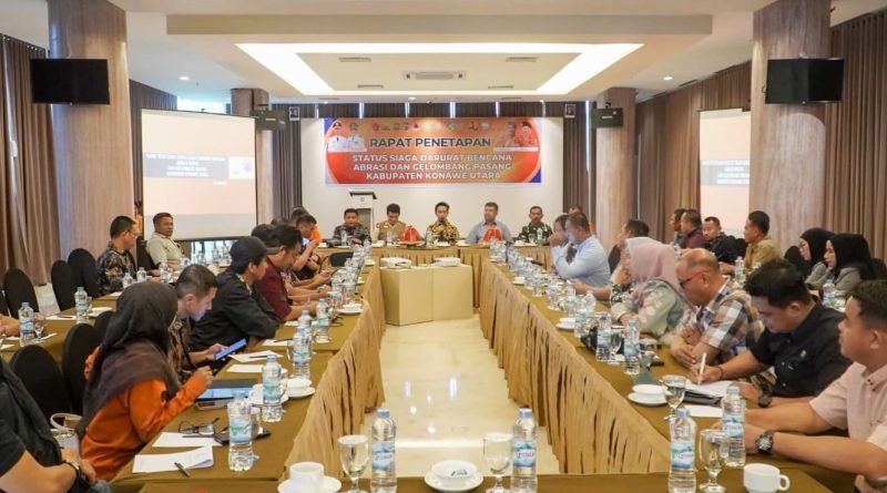 Bupati Konawe Utara, H. Ikbar, SH., MH, bersama Wakil Bupati H. Abuhaera, S.Sos., M.Si, langsung memimpin Rapat Penetapan Status Siaga Darurat Bencana Abrasi dan Gelombang Pasang. Rapat berlangsung di Hotel Claro Kendari, Jumat (26/9/2025), dengan melibatkan jajaran Forkopimda, BPBD, Dinas Sosial, Dinas Kesehatan, serta unsur TNI-Polri.
